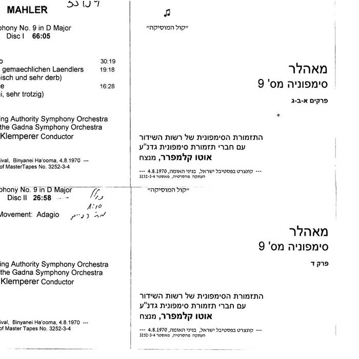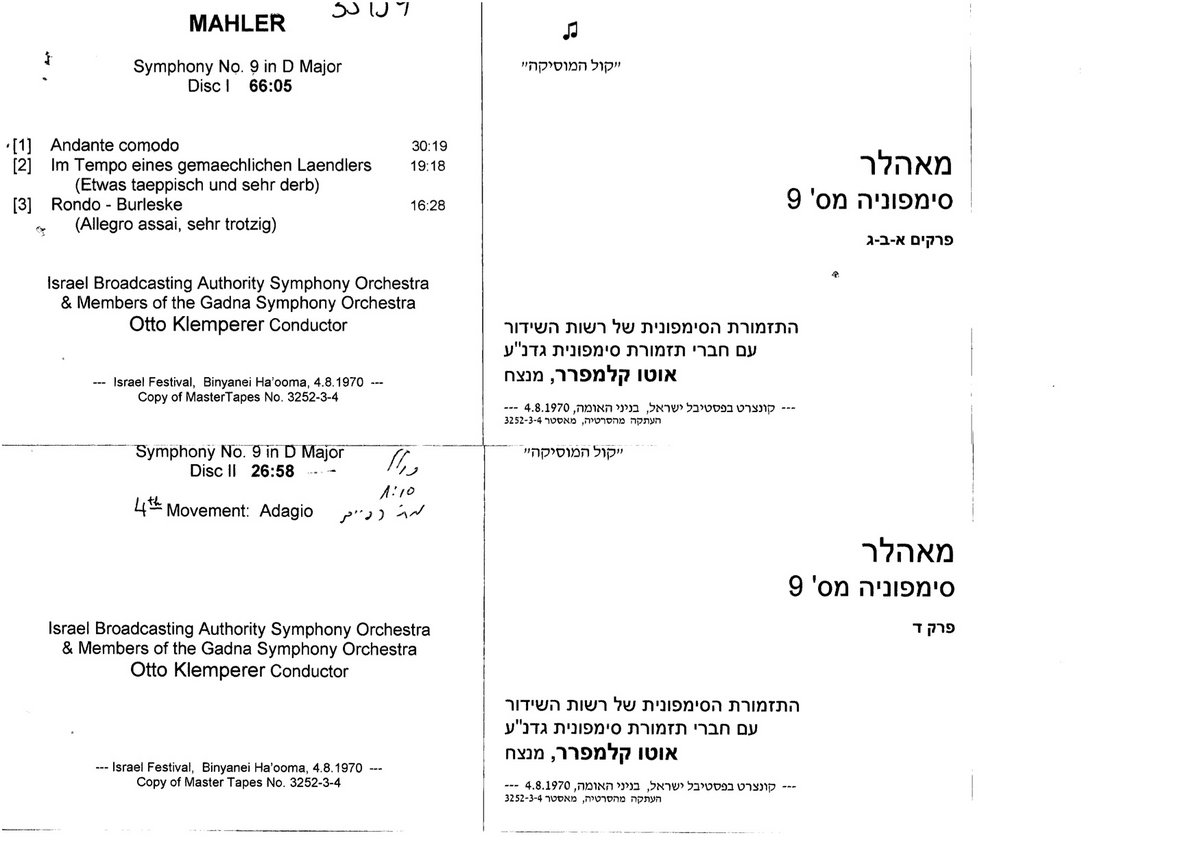 from Mahler - Symphony no. 9, Otto Klemperer conducting by Jerusalem Symphony Orchestra